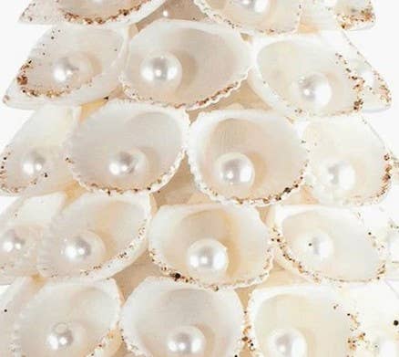 Clamrose Shell Cone Tree w/Pearls (White/Gold) Available in 8" & 12" sizes Made of natural clamrose shells with faux pearls. Handmade