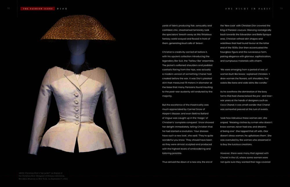 Christian Dior was a French fashion designer who founded the iconic fashion house Dior in 1946.He was known for his elegant, feminine designs, and his use of luxurious fabrics and intricate details. This beautifully illustrated book includes images of Christian Dior's designs. The book includes a detailed look at some of Dior's most important creations: The "New Look" silhouette - Dior's debut collection in 1947 featured a new silhouette that emphasized the female figure, with nipped-in waists, full skirts, and rounded shoulders. The Bar suit - this tailored suit was a cornerstone of Dior's early collections. The jacket featured a cinched waist, padded hips, and a deep V-neckline, while the skirt flared out from the hips to create a full, feminine silhouette. The Miss Dior dress - this elegant, off-the-shoulder cocktail dress was inspired by Dior's love of flowers. It featured a fitted bodice and a full, flared skirt, and it was often made in soft, romantic fabrics like silk and tulle.