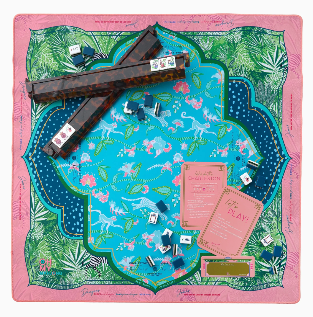 Go wild for the Serengeti Mat, a stunning collaboration with Fort Worth-based fashion designer Sheridan French. Inspired by the jungle's playful spirit and rich beauty, this mat features a lush palette of aqua, coral, and tropical greens, brought to life with cheeky monkeys, striped zebras, and vivid jungle foliage. Designed to pair beautifully with the Glow Wild Tiles (but versatile enough to match many of our sets), the Serengeti Mat brings a sense of adventure, color, and charm to every game.
