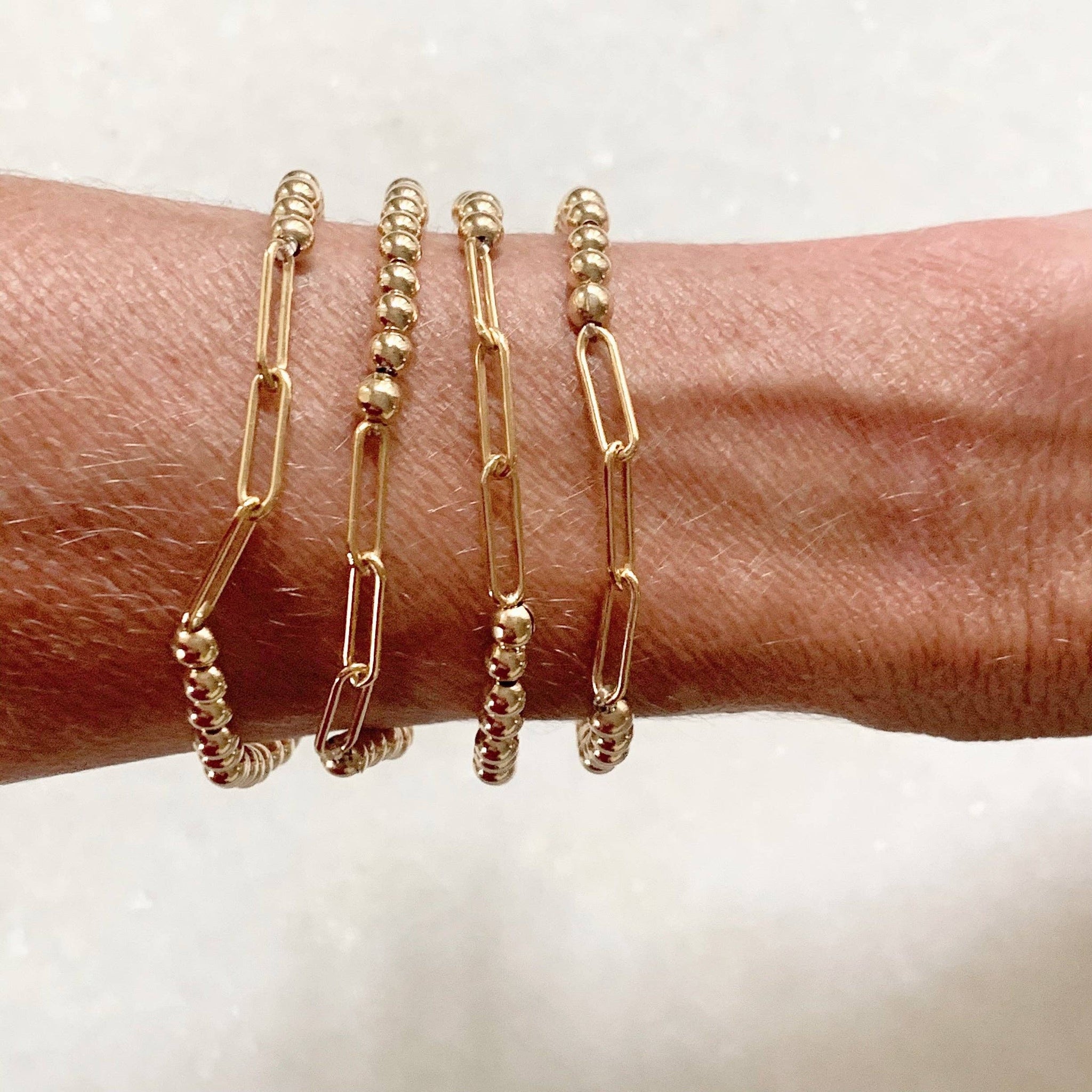 * 14k gold filled links on 14k gold filled beaded bracelet * Beads are size 4mm (medium size) * Comfortably fits wrist up to 7 *Pictured are multiple bracelets, they are sold in units of one bracelet, not all of them pictured.