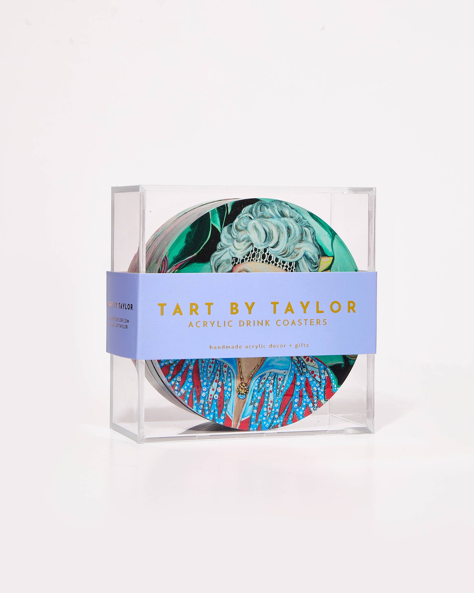 Thank you for being a friend! Our favorite group of ladies is now our favorite coaster set. Artwork is by Drunk Girl Designs artist, Heather Perry and features our Golden Gals in their best 80's workout wear. BRB while we go binge watch with our best friends! - These coasters are sold as a set of 4 (can not be purchased individually) - Size: 4'' Diam x .5'' H - Made of acrylic - Handmade with love in Dallas, Texas - Use a soft damp cloth to clean and keep inside.