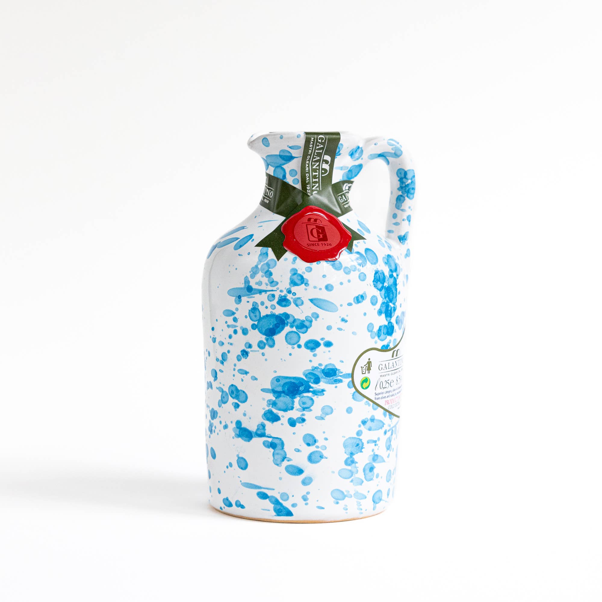 The “Fantasia" ceramic bottle comes in a variety of colors and patterns and is hand-painted by local artisans of the Puglia region of Italy, where the award-winning Frantoio Galantino olive mill is located. Perfect for gifting this Christmas. It is filled with their delicious and authentic extra virgin olive oil made from Ogliarola and Coratina olives. Golden yellow-green in color and well balanced flavors of almond and artichoke make this an ideal extra virgin olive oil for everyday use. Great for cooking and for dressing a salad!
