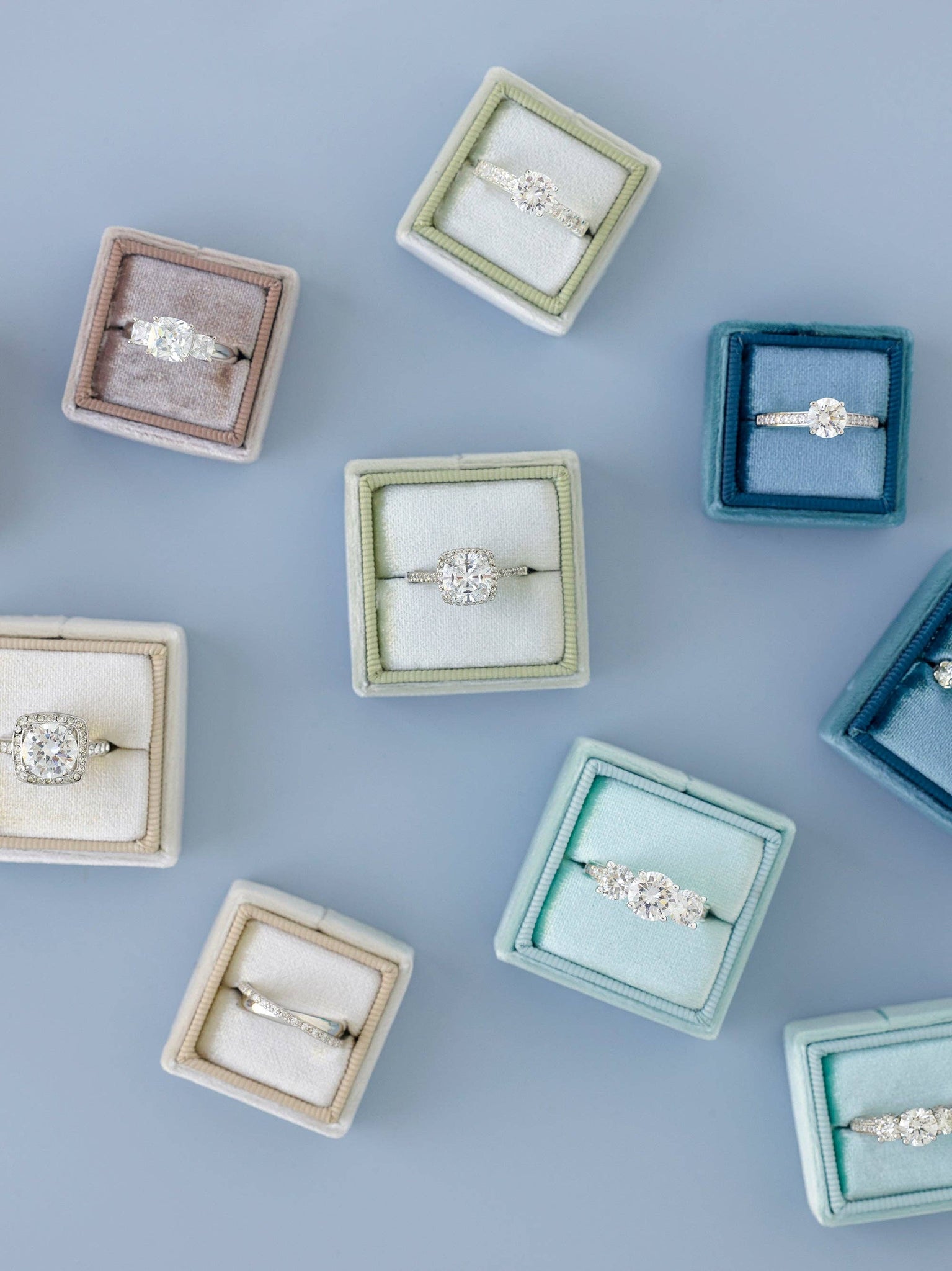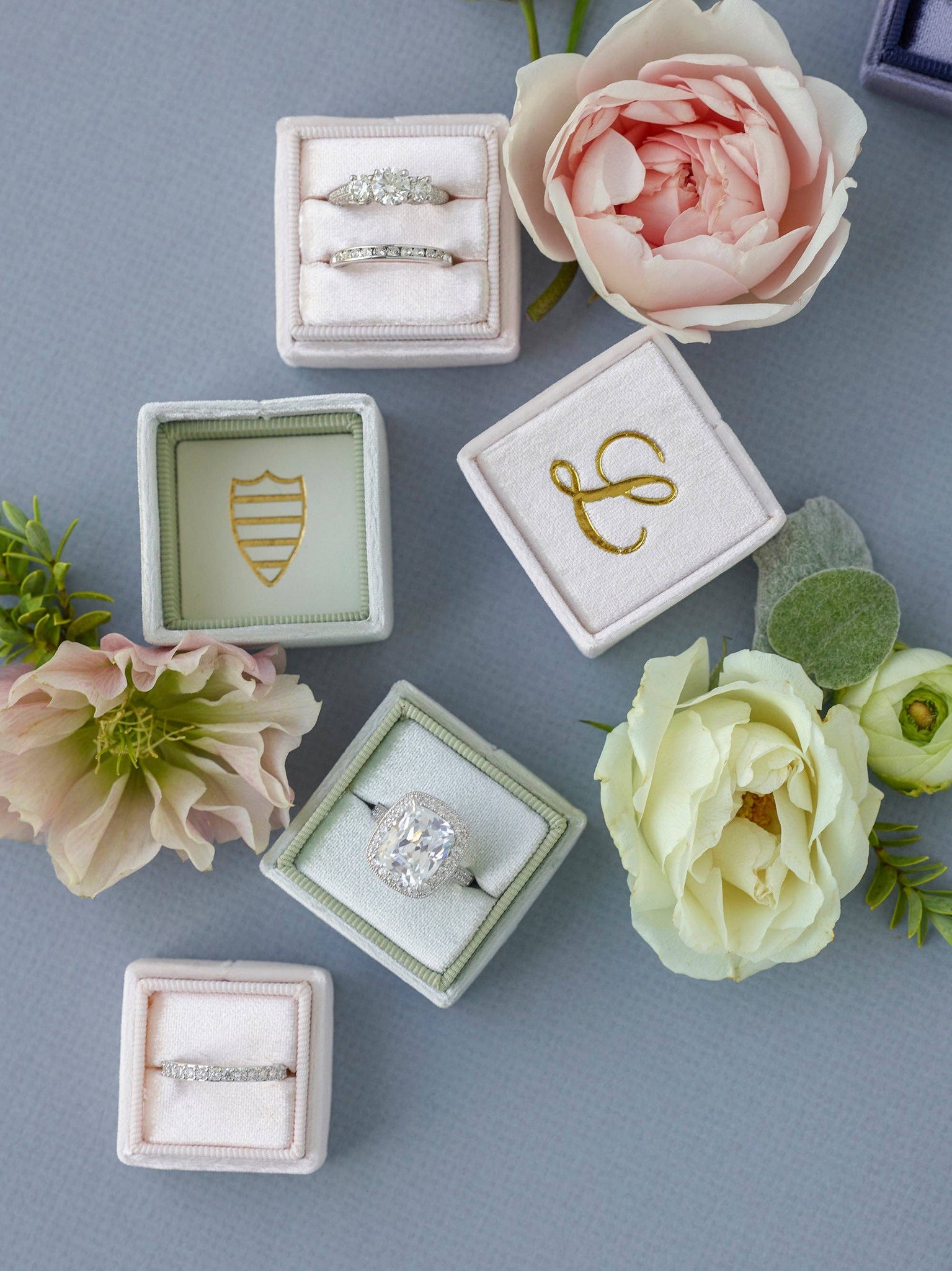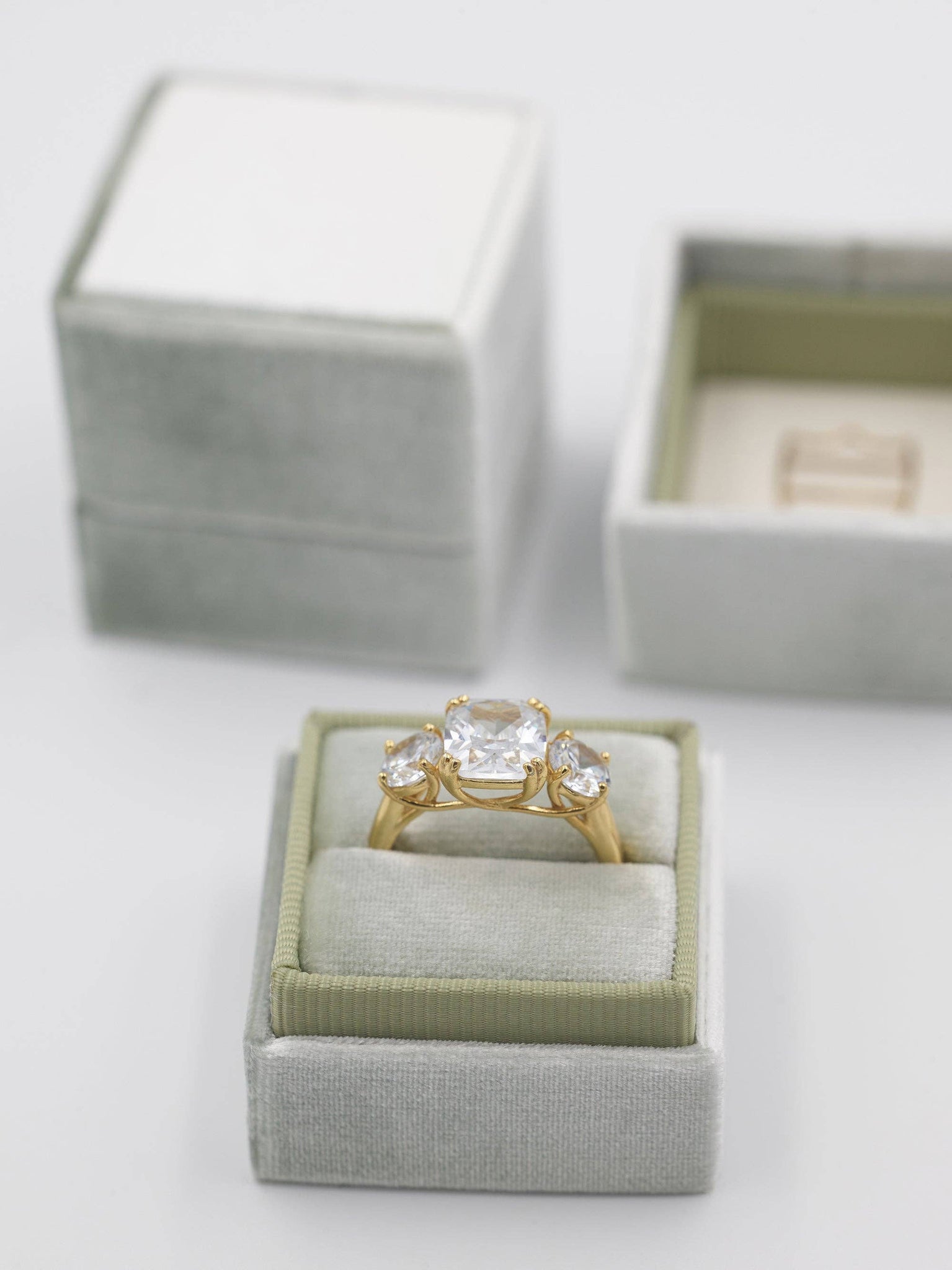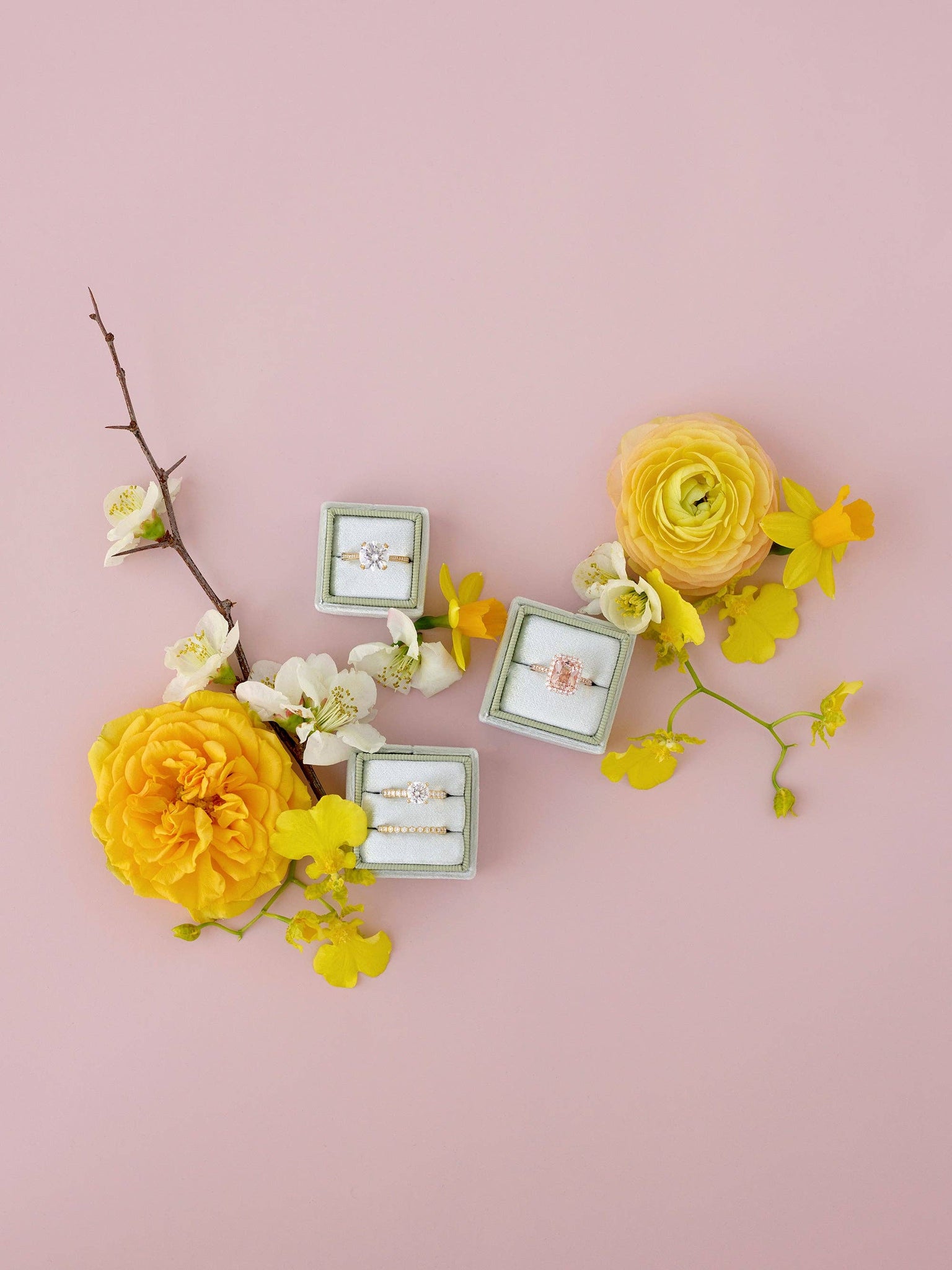The Adeline embodies crunchy green spring and her scent is composed of fresh grass and jasmine flowers moving in the dry breeze. Everything is new, and being with her is like waking up from a long slumber ready to have a fling with the sunshine and her colors. * About * Fit * Monograms Our boxes are purposely petite, measuring 3.5 cm on all sides. They are individually handmade using what we consider to be the world's most extraordinary velvet. Featuring custom colors made exclusively for us, our new boxes are so exquisite they literally sparkle in person, reflecting light in the most glorious way possible. Will my ring fit? Our boxes are meant to be petite so that your ring is the central focus.