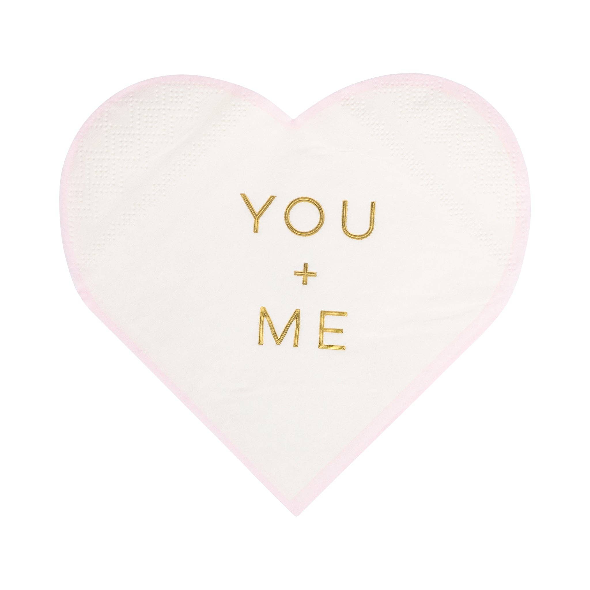 Spread the love this Valentine's Day with our charming You + Me Cocktail Napkins! These delightful heart-shaped napkins feature a sweet romantic design perfect for celebrating your special someone. Make your celebration unforgettable with these adorable napkins! • “YOU + ME” heart-shaped cocktail paper napkins • Cream-colored hearts with a pink outline and gold foil “You + Me” lettering • 18 napkins included • Folded napkins measure 5" x 5" Note: Limited Run pieces may be carried by larger platform and box locations in your area. 3 sets make 1 wholesale pack.