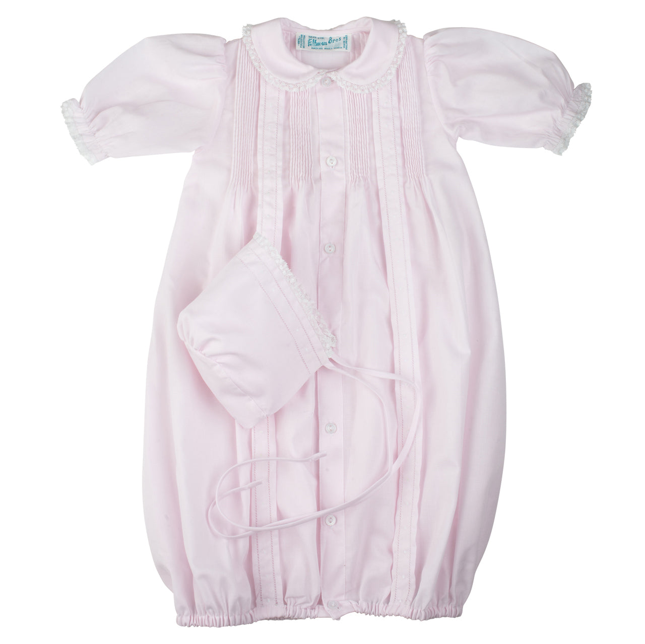 Your little one will look as pretty as can be in this beautiful vintage style baby dress. This dress features a sweet peter pan collar edged with fluted French lace, as well as lace inserts between inverted pleats down the center, embellished with soft floral embroidery. Available in white on pink or pink on white, and lovely in either option! A unique and classy ensemble for your sweet little princess - perfect for Easter, Sunday wear, or everyday occasions made special!